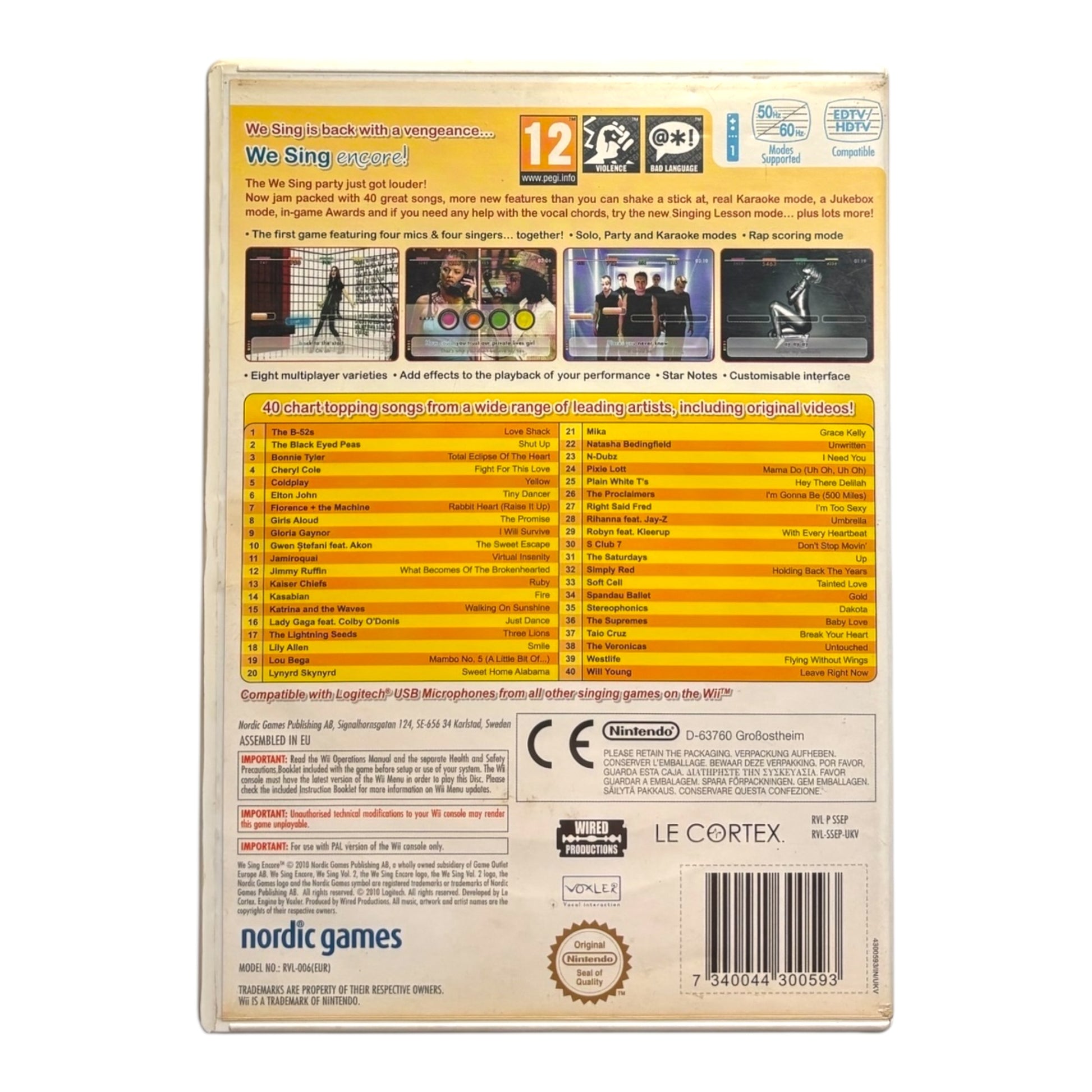 We Sing Encore is een karaokespel voor de Wii en het vervolg op het populaire We Sing. Het bevat een uitgebreide tracklist van internationale en lokale hits. Met ondersteuning voor maximaal vier microfoons kun je samen met vrienden en familie zingen in verschillende modi, zoals duet, battle en karaoke party.