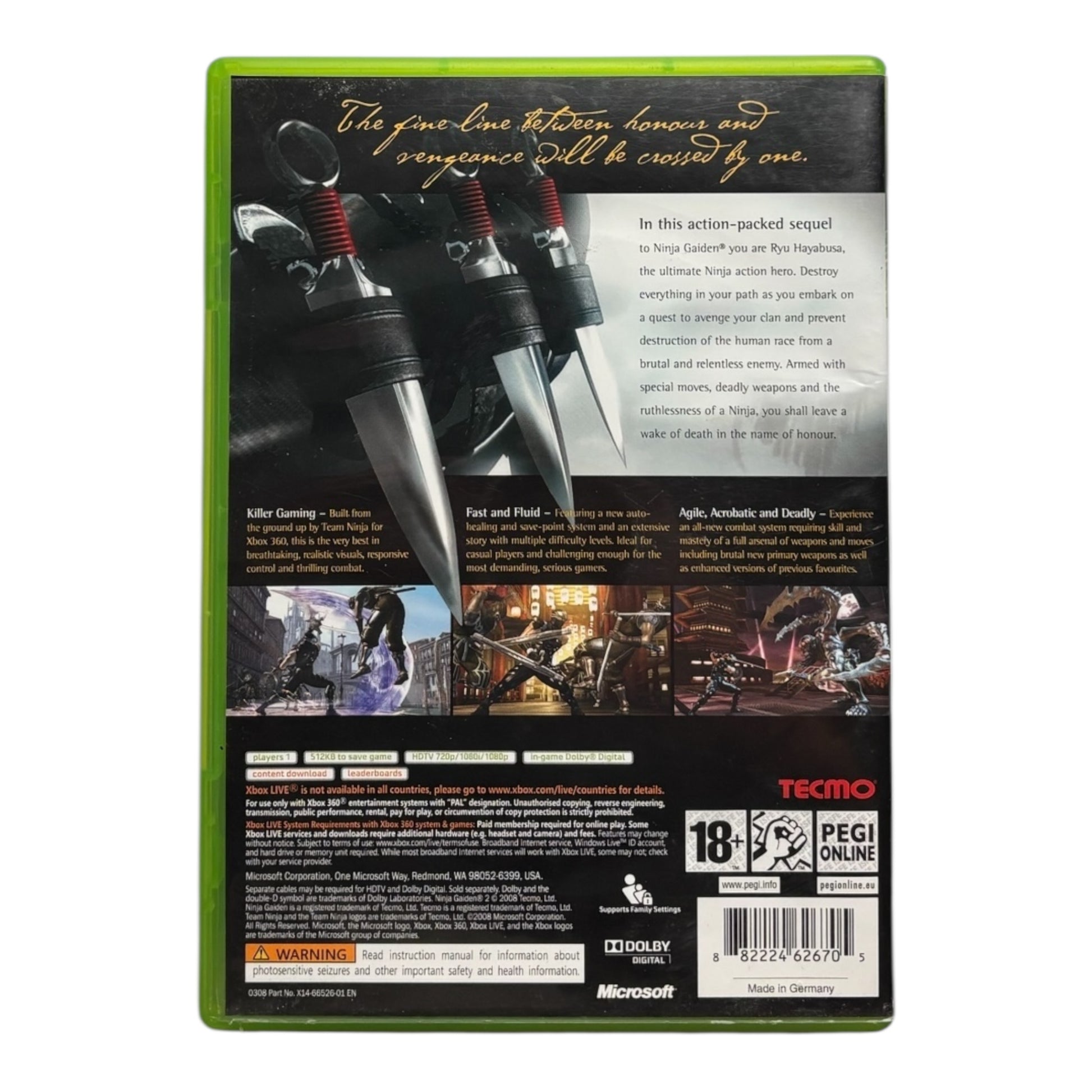 Ninja Gaiden II is een hack-and-slash actiegame ontwikkeld door Team Ninja en exclusief uitgebracht voor de Xbox 360. Spelers kruipen in de huid van Ryu Hayabusa, een meesterlijke ninja die het opneemt tegen demonische vijanden en meedogenloze tegenstanders. Het spel staat bekend om zijn snelle, uitdagende combat waarin precisie, timing en combo’s cruciaal zijn. Ryu beschikt over een breed arsenaal aan wapens, waaronder katana’s, dubbele zwaarden en boogwapens, die elk een eigen vechtstijl en tactiek vereisen.