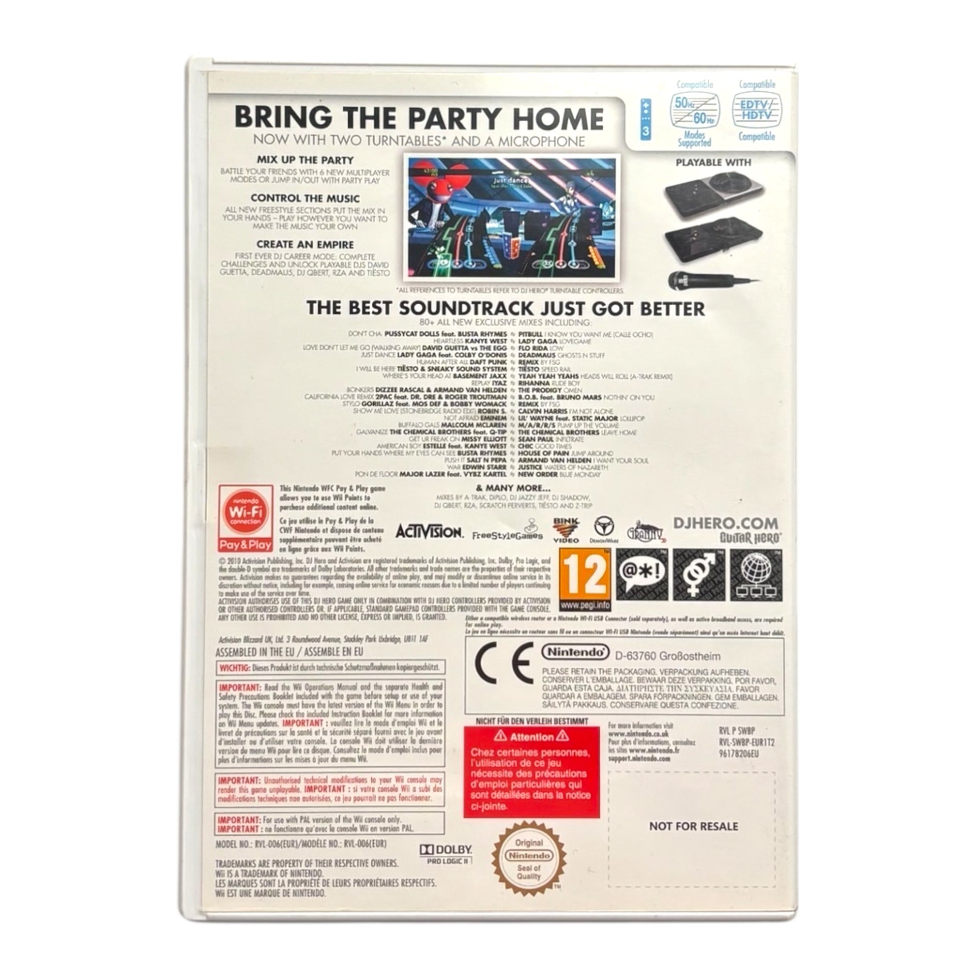 DJ Hero 2 is een ritme- en muziekspel voor de Wii waarin je als DJ optreedt met behulp van een speciale draaitafelcontroller. Het spel bevat een grote collectie mash-ups en remixes van populaire nummers en biedt zowel singleplayer- als multiplayer-modi, inclusief freestyle-opties voor scratchen, mixen en zang.
