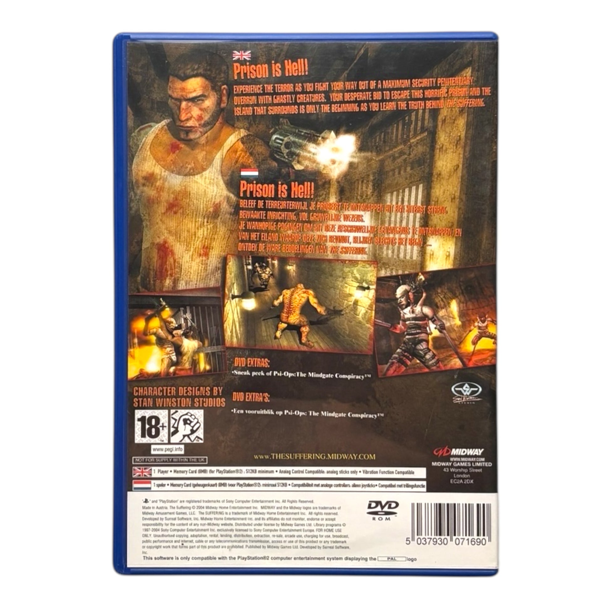 The Suffering is een horror-actiespel dat werd uitgebracht voor de PlayStation 2 in 2004. De speler kruipt in de huid van Torque, een terdoodveroordeelde gevangene die zich plotseling midden in een nachtmerrie bevindt wanneer bovennatuurlijke wezens een gevangenis op een afgelegen eiland aanvallen. Terwijl hij vecht om te overleven, ontrafelt hij geleidelijk zijn eigen mysterieuze verleden en keuzes. De game combineert third-person actie met psychologische horror en biedt spelers de mogelijkheid om beslissingen te nemen die het verloop van het verhaal beïnvloeden.