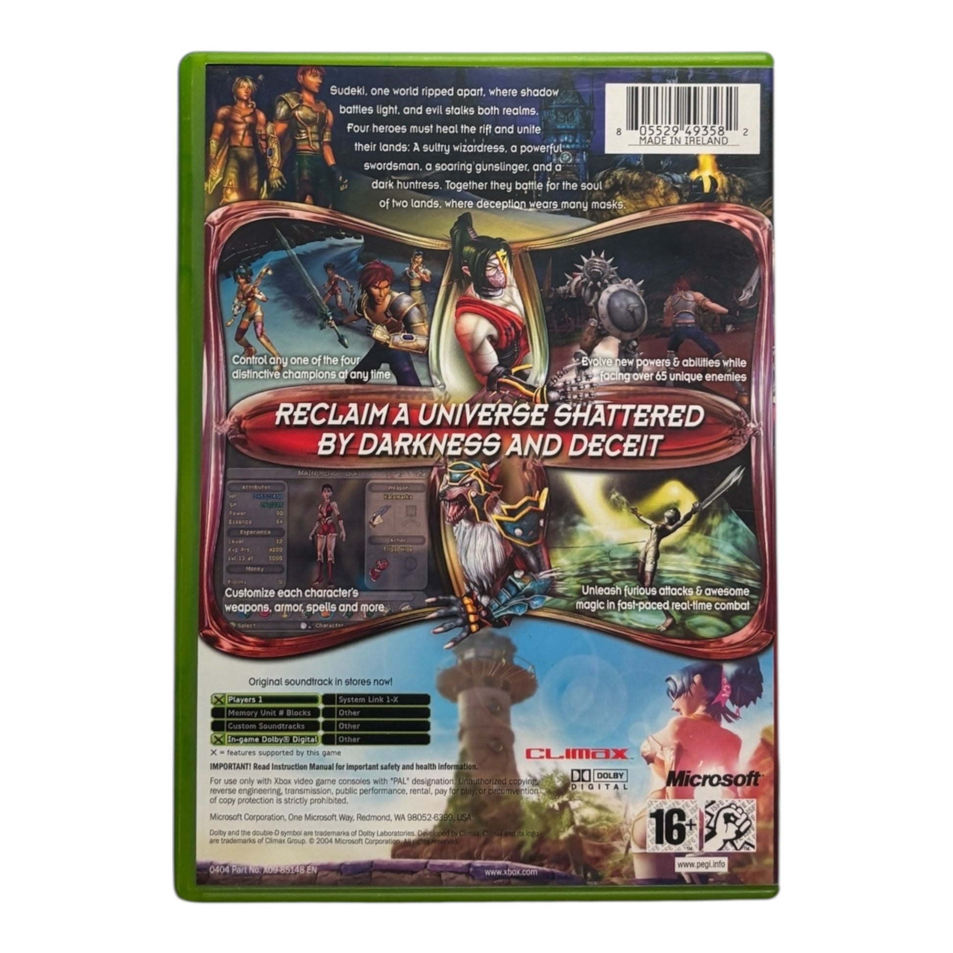Sudeki is een actie-RPG exclusief ontwikkeld voor de originele Xbox, en combineert snelle combat met kleurrijke, anime-geïnspireerde visuals. De game speelt zich af in de wereld van Haskilia, een rijk dat verscheurd wordt door duistere krachten. Je bestuurt een groep van vier helden — elk met unieke vechtstijlen, magie en wapens — in een verhaal vol magie, technologie en verraad. Met zijn mix van realtime actie, party-management en JRPG-invloeden was Sudeki een opvallende titel in het Xbox-aanbod.
