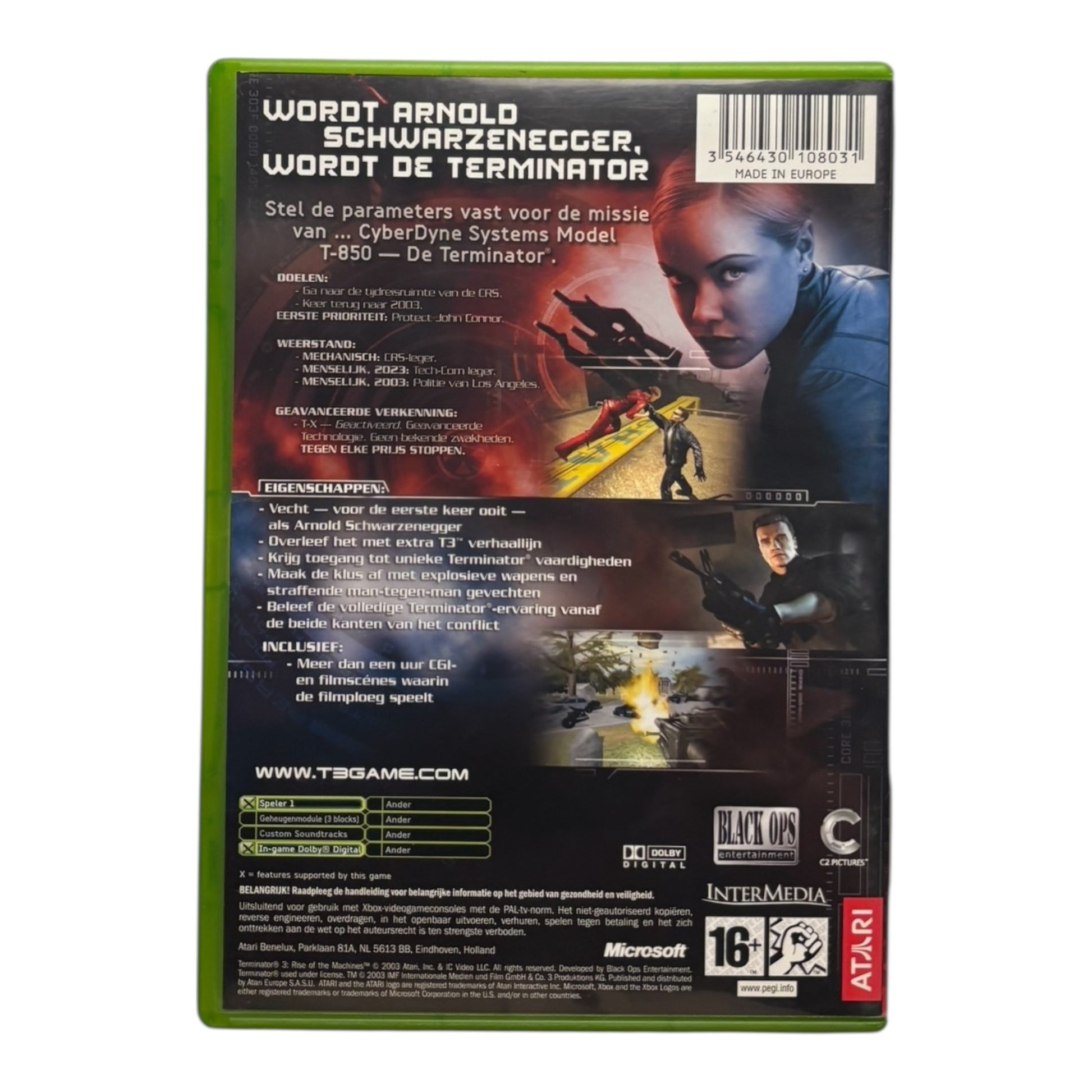 Gebaseerd op de gelijknamige film uit 2003, plaatst Terminator 3: Rise of the Machines je midden in de oorlog tussen mens en machine. Je kruipt in de huid van een T-850 (Arnold Schwarzenegger) die terug in de tijd reist om John Connor te beschermen tegen Skynet’s nieuwste dreiging: de dodelijke T-X. De game combineert first-person shooting met enkele third-person gevechten en bevat exclusieve scènes en actie die niet in de film voorkomen, met Arnold zelf als stemacteur.