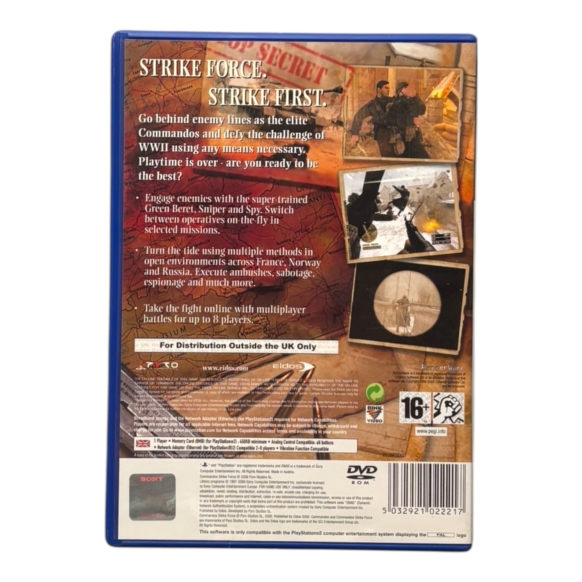 Commandos: Strike Force is een first-person shooter die afwijkt van de klassieke tactische gameplay uit de eerdere Commandos-reeks. In deze game vecht je tijdens de Tweede Wereldoorlog met drie verschillende elite-agenten van de geallieerden: een scherpschutter, een spion en een commando. Elke missie vraagt om een andere aanpak: sluipen, sabotage of keiharde actie. De game combineert stealth- en schietelementen, en biedt variatie in speelstijl door het wisselen tussen personages.