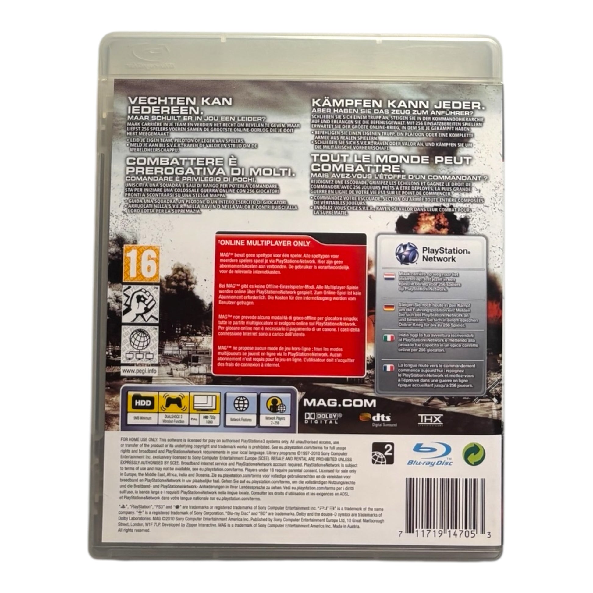 MAG is een online multiplayer first-person shooter die exclusief werd uitgebracht voor de PlayStation 3. De game viel op door zijn ambitieuze schaal: gevechten met maximaal 256 spelers tegelijk op één slagveld. Spelers sloten zich aan bij één van drie militaire facties – Raven, S.V.E.R. of Valor – elk met unieke wapens, uitrusting en visuele stijl. De gevechten waren hiërarchisch georganiseerd, waarbij ervaren spelers leidinggevende rollen konden aannemen, zoals squad leader of platoon commander. Tactiek, samenwerking en communicatie stonden centraal in deze grootschalige online oorlogsvoering.